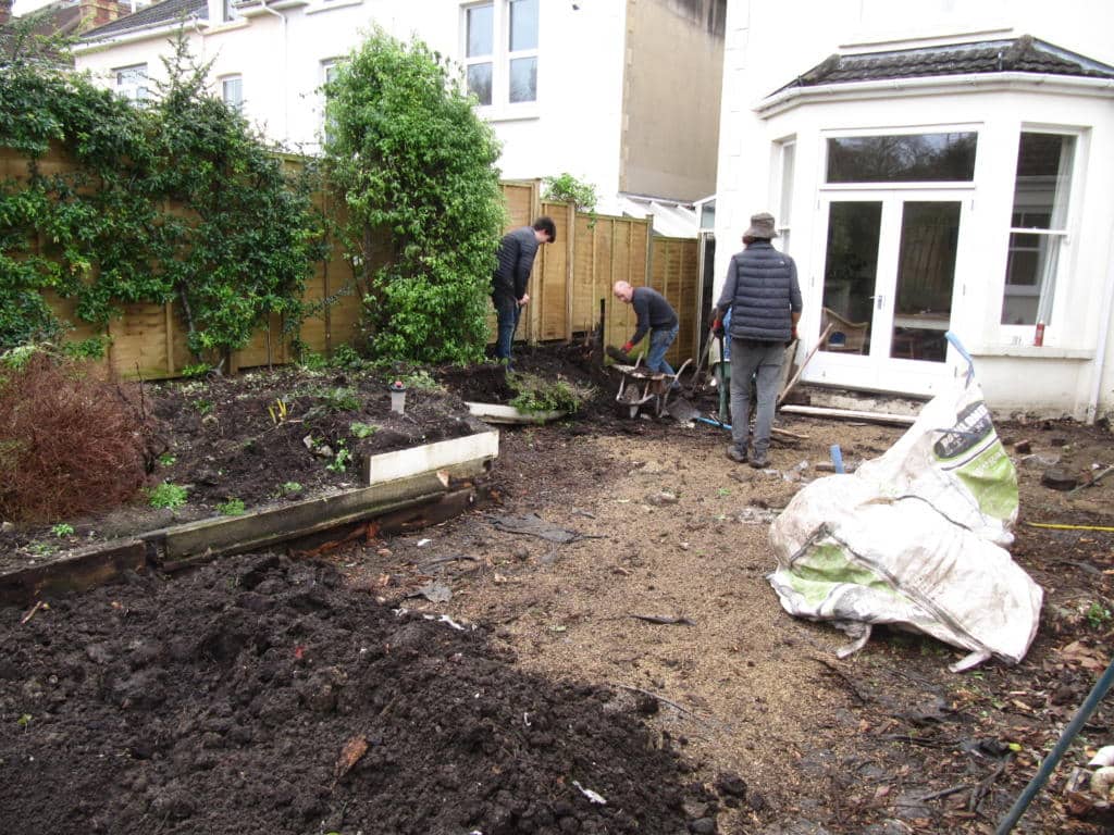 The shrubs and soil are removed from the border, excepting the Pyracantha that is growing up the fence. This will stay as part of the new raised bed. The soil will be used to lay new turf in the garden, when the lawn is extended down to the new patio.