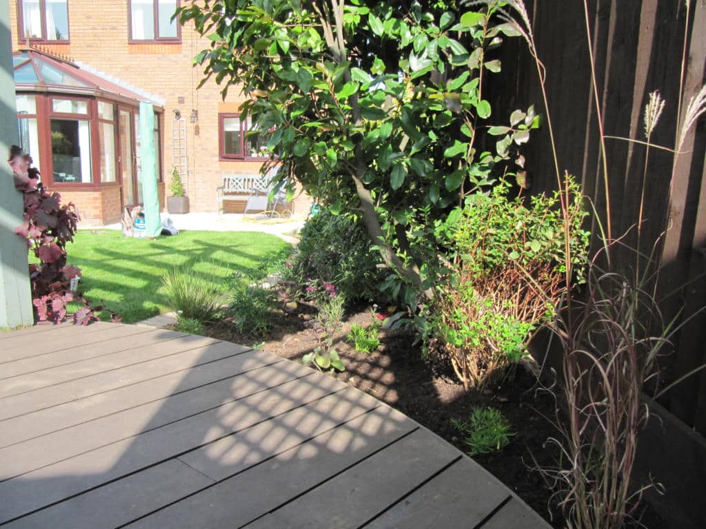 The circular decked pergola looks stunning and will have climbers growing up each post to eventually give shade when sitting under it. I love the shadows created by the crossbeams, they jut out across the garden and draw the eye towards the conservatory.