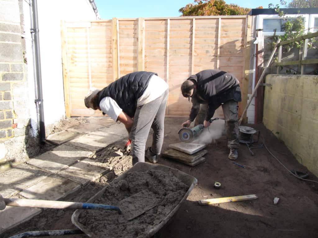These old concrete paving slabs were removed from the back garden. We stacked them up, out of the way whilst we worked on laying the new paving, and then got busy laying them in their lane behind the garden.
