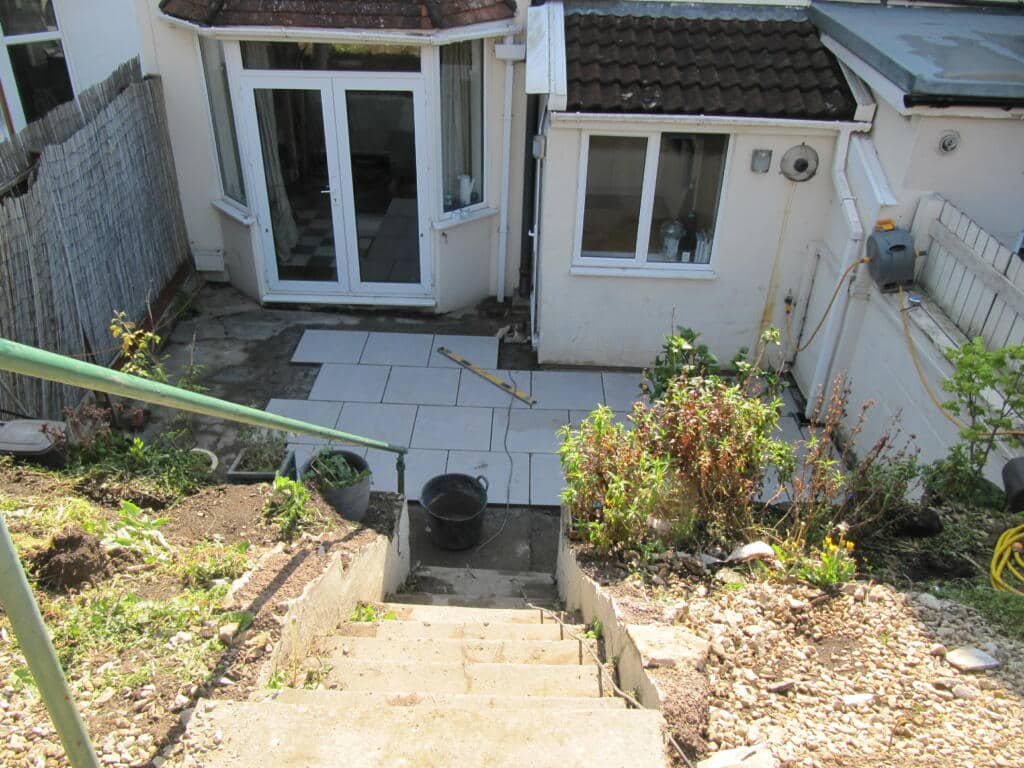 Although we’ve had some down pours and gales, the weather on the whole has been dry and sunny, which has meant the team have really cracked on with the job. Old wooden steps come down from the garage at the very top of the garden, onto a levelled area and then down more steps to the ground floor with the back door.