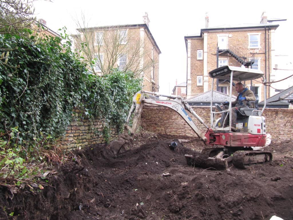 The low raised bed walls were knocked out, trees removed (some to be replanted later), and turf ripped up. Plants had to be dug ...