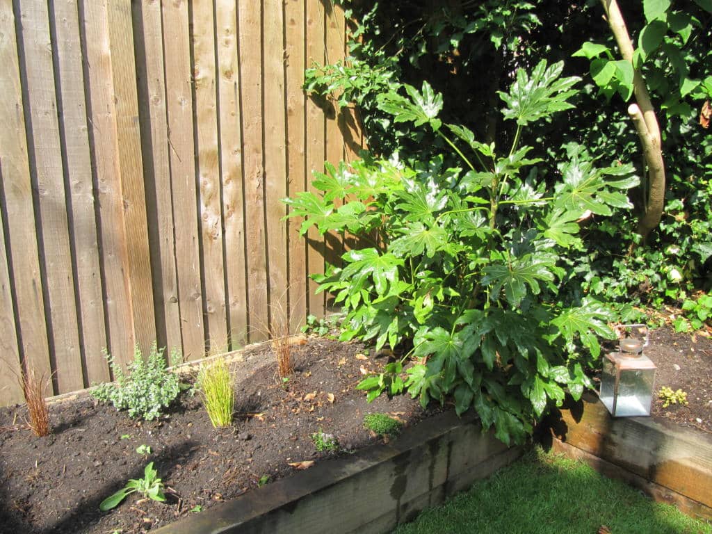 The left hand side border gets more sun throughout the day and the back border has more shade, so we chose suitable plants for both ...