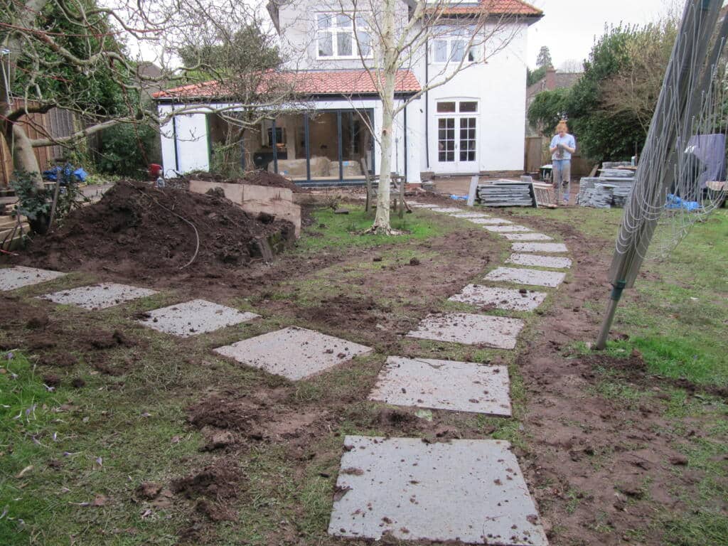 The patio in the back garden was constructed with brick edging and later paved with grey limestone. Have a look at photos of this work ...